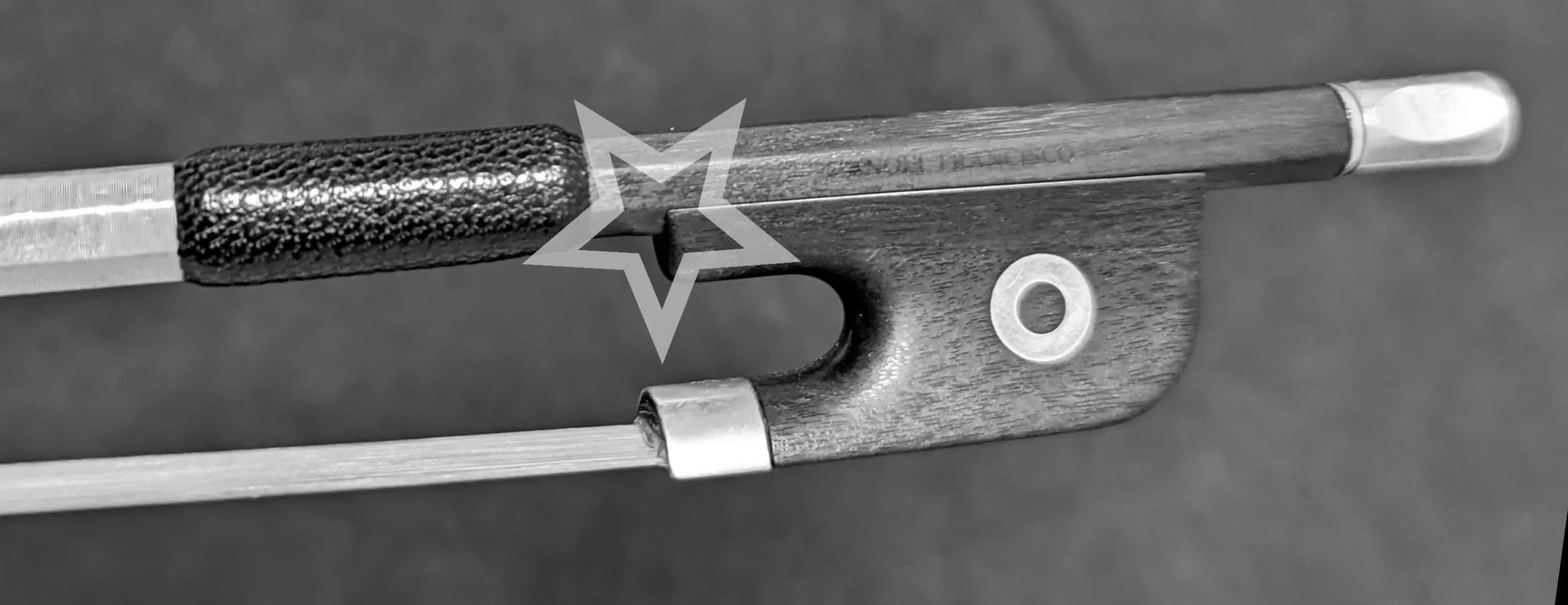 The black piece that holds the hair on a bow is called the frog. Your thumb should touch the bow on the stick right next to the frog. The star in this picture shows where your thumb should go.